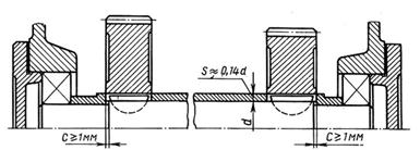 Буртик на валу устанавливают так, чтобы осевая сила была направлена на буртик. При ее отсутствии буртик не нужен. Для гарантии контакта втулки и колеса предусматривают зазор С между уступом вала и торцом колеса. Толщина распорной (дистанционной) втулки S ≈ 0,14 d (рис. 23.23).