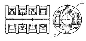 Продольно-свертная муфта (рис. 24.4) выполняется из двух полумуфт (1) и (2), разделенных по плоскости, проходящей через ось валов.