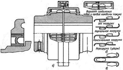 Муфта со змеевидной пружиной состоит из двух полумуфт с зубьями специального очертания, между которыми свободно заложены секции ленточной змеевидной пружины прямоугольного сечения (рис. 24.7). Кожух, состоящий из двух половин, удерживает пружину от выскакивания под действием центробежных сил и служит резервуаром для пластичного смазочного материала, который меняют через каждые четыре месяца.