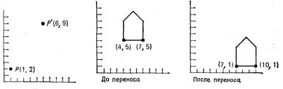 Объект можно перенести, применяя вышевыведенное уравнения к каждой его точке. Однако, поскольку каждый отрезок, описывающий объект, состоит из бесконечного числа точек, такой процесс длился бы бесконечно долго. К счастью, все точки, принадлежащие отрезку, можно перенести путем перемещения одних лишь крайних точек отрезка и последующего вычерчивания нового отрезка между получившимися в результате точками. Это справедливо также для масштабирования (растяжения) и поворота. На рис. 2.1 показан результат действия на контур домика операции переноса на расстояние (3, -4).