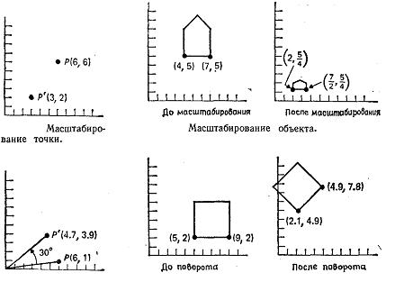 На рис. 2.2 отдельная точка (6, 6) масштабируется с коэффициентами 1/2 по оси X и 1/3 по оси у. На этом же рисунке показан контур домика, промасштабированный с коэффициентами 1/2 по оси x и 1/4 по оси у. Отметим, что масштабирование производится относительно начала координат; в результате преобразования домик стал меньше и ближе к началу координат. Если бы масштабные множители были больше 1, то домик увеличился бы и отдалился от начала координат. Способы проведения масштабирования относительно других точек, отличных от начала координат, рассматриваются в одном из последующих разделов главы. Пропорции домика также изменились· было применено неоднородное масштабирование, при котором S х≠ Sу. Однородное масштабирование, для которого Sx=Sy, не влияет на пропорции.