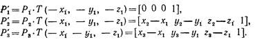 Путем объединения элементарных трехмерных преобразований можно получить другие преобразования. В этом разделе показано, как это сделать. Задача состоит в том, чтобы преобразовать отрезки P1P2 и P1P3 (рис. 2.5) из начальной позиции в конечную. Точка Pi переносится в начало координат, P1P2 располагается вдоль отрицательной полуоси x, а P1P3 помещается в плоскости yz в той ее половине, где ось у положительна. На длины отрезков преобразование не воздействует.