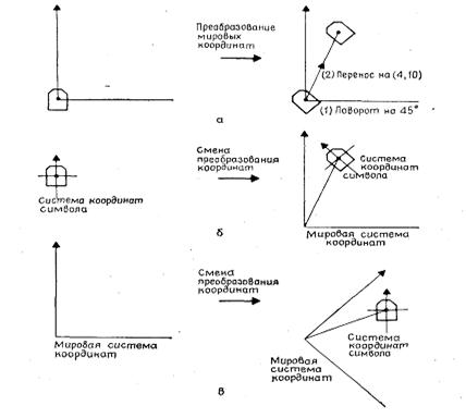 Описание всех объектов (символов) в мировой системе координат и последующее размещение их в желаемом месте, приводит до некоторой степени к нереалистичному изображению всех символов, первоначально заданных один поверх другого в одной и той же мировой системе координат. Более естественно полагать, что каждый символ задан в своей собственной системе координат и затем промасштабирован, повернут и перенесен путем преобразования координат в новую мировую систему координат. Второй подход легко представить себе как сжатие или растяжение, поворот и позиционирование на мировой координатной плоскости отдельных листков бумаги, на каждом из которых изображен символ (или наоборот, сжатие или растяжение, поворот и перемещение плоскости относительно каждого из листков бумаги). С математической точки зрения оба подхода идентичны.