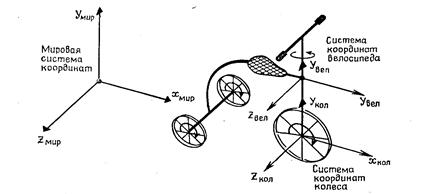 Подход, основанный на изменении систем координат, удобен в тех случаях, когда задается дополнительная информация для подобъектов в их локальных системах координат. Например, если к переднему колесу трехколесного велосипеда (рис. 2.8) приложить крутящий момент, то все его колеса повернутся. Нам необходимо определить, насколько велосипед переместится в пространстве как единое целое. Эта задача более сложная, чем та, которая связана с размещением символов, поскольку здесь требуется несколько последовательных изменений систем координат. В начальный момент системы координат велосипеда и его переднего колеса заданы относительно мировой системы координат. При движении велосипеда вперед переднее колесо поворачивается вокруг оси z системы координат колеса, и одновременно системы координат колеса и велосипеда перемещаются относительно мировой системы координат. Системы координат колеса и велосипеда связаны с мировой системой координат с помощью зависящих от времени переносов вдоль осей x и у иповорота вокруг оси у. Координатные системы велосипеда и колеса между собой связаны с помощью зависящего от времени поворота вокруг оси у, вызываемого поворотом руля. (Система координат велосипеда связана с рамой велосипеда, а не с рулем).