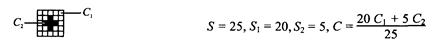 Расчет цвета, который соответствует одной из комбинаций пикселов в ячейке, можно выполнить следующим образом. Если пикселы ячейки могут быть только двух цветов (С1 и С2), то необходимо подсчитать часть площади ячейки для пикселов каждого цвета. Цвет ячейки С можно оценить соотношением