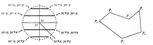 Заполнение круга. Для заполнения круга можно использовать алгоритм вывода контура. В процессе выполнения этого алгоритма последовательно вычисляются координаты пикселов контура в границах одного октанта. Для заполнения следует выводить горизонтали, которые соединяют пары точек на контуре, расположенные симметрично относительно оси y (рис. 3.39, слева).