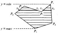 При нахождении точек пересечения горизонтали с контуром необходимо принимать во внимание особые точки. Если горизонталь имеет координату (у), совпадающую с координатой yi вершины Рi тогда надлежит анализировать то, как горизонталь проходит через вершину. Если горизонталь при этом пересекает контур, как, например, в вершинах Р0 ли Р4, то в массив записывается одна точка пересечения. Если горизонталь касается вершины контура (в этом случае вершина соответствует локальному минимуму или максимуму, как, например, в вершинах Р1, Р2, Р3 или Р5), тогда координата точки касания или Не записывается, или записывается в массив два раза. Это является условием четного количества точек пересечения, хранящихся в массиве {хj}.