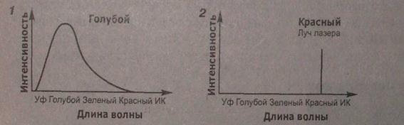 Рис. 5.5. Источники света: 1 - в виде смеси длин волн, воспринимаемой как голубой цвет в соответствии с цветом доминирующей длины волны; 2 - монохроматический красный цвет