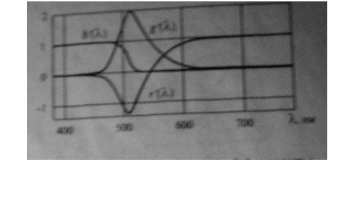 Как видим, коэффициенты r', g', b' могут быть и положительными, и отрицательными, суммой компонентов R,G,B. Но как отнять то, чего нет? Для уравнивания цвета пришлось прибавить к монохроматическому излучению один из компонентов R,G или B. Например, если монохромическое излучение для некоторого значения ג разбавлялось красным, то это можно выразить так: