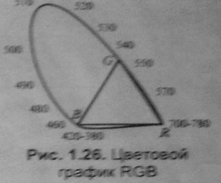 Таким образом, система RGB имеет неполный цветовой охват - некоторые насыщенные цвета не могут быть представлены смесью указанных трех компонентов. В первую очередь, это цвета от зеленого к синему, включая все оттенки голубого - они соответствуют левой части кривой цветового графика. Ещё раз подчеркнем, что речь здесь идет о насыщенных цветах, так как ненасыщенные голубые цвета получить можно смешиванием компонентов RGB. Несмотря на неполный охват, система RGB широко используется в данное время - в первую очередь, в цветных телевизорах и дисплеях компьютеров. Отсутствие некоторых оттенков цвета не слишком заметно.
