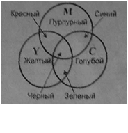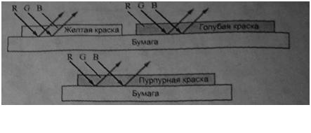 Нанесение желтой краски на белую бумагу означает, что поглощается отраженный синий цвет. Голубая краска поглощает красный цвет. Пурпурная краска — зеленый. Комби-нированне красок позволяет получить цвета, которые остались — зеленый, красный, синий и черный. Черный соответствует поглощению всех цветов при отражении.