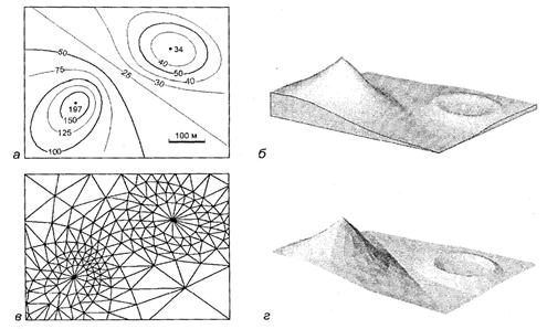 Рис. 6.15 Пример поверхности: а — изолинии высоты; б — вид поверхности; в — фрагмент триангуляционной сетки; г — поверхность из треугольников (здесь нарочно подчеркнуты отдельные треугольные грани)