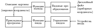 Существенным этапом в области стандартизации машинной графики явилась публикация проекта стандарта CORE-SYSTEM (GSPC-77), модель которой приведена на рис. 7.5. Главные идеи, положенные в основу системы CORE: разделение функций ввода и вывода; минимизация отличий между выводом на графопостроитель и интерактивный дисплей; концепция двух координатных систем - мировой системы координат, в которой конструируется выдаваемое изображение, и приборной системы координат, в которой представляются данные для отображения; концепция дисплейного файла, содержащего приборную координатную информацию; понятие дисплейного файла сегментов, каждый из которых может независимо модифицироваться как элемент; обеспечение функций преобразования данных из мировой системы координат в приборную путем вызова видового преобразования.