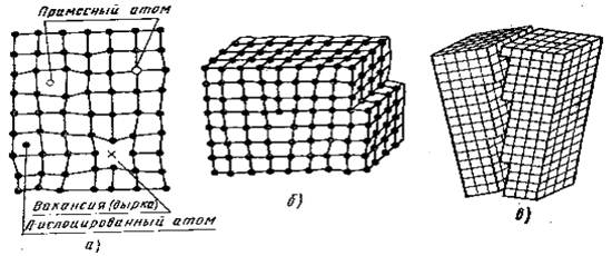 Реальные кристаллы их строение и свойства существенно отличаются от идеальных, вследствие наличия в них внутренних и поверхностных дефектов. Внутренние дефекты (рис. 2.2.) подразделяются на три вида.