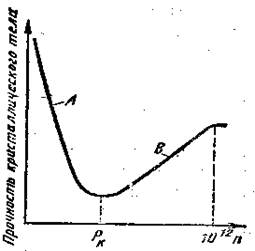 п – число дефектов, РК – точка характеризующая прочность чистых металлов, А – ветвь характеризующая резкое снижение прочности, В – ветвь характеризующая повышение прочности при пластическом деформировании или введением легирующих элементов.