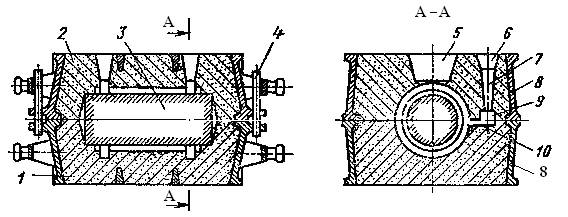 4 – металлический центрирующий штырь, 5 – выпор (прибыль), 6 – литниковая чаша, 7 – стояк, 8 – опока, 9 – шлакоуловитель, 10 – питатель.