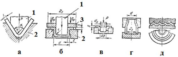 а – гибка; б – вытяжка; в – отбортовка; г – обжим; д – рельефная формовка;