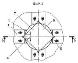 Обкатывающий пуансон 2 в начальной стадии процесса входит в матрицу 1 и центрируется по ней, а затем происходит его силовое воздействие на заготовку 7 и, исходя из того, что матрица 1 и пуансон 2 имеют острые кромки, происходит отрубка (отделение) углов 8 на заготовке до получения ее длины по диагонали равной диаметру готовой заготовки.
