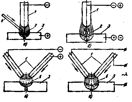 В практике применяют следующие схемы дуговой сварки (рис. 6.4.).