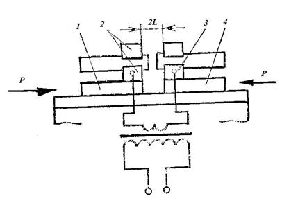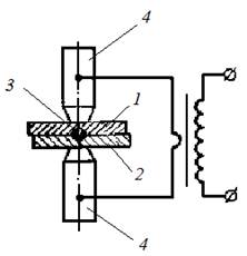 1,2 – соединяемые заготовки; 3 – пятно контакта; 4 – медные электроды.