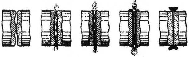 2. Стыковая сварка оплавлением – метод сварки, при котором детали сближают с одновременным включением тока. В момент сближения торцов начинается процесс расплавления единичных выступов. По мере продолжающегося сближения деталей число контактов непрерывно растет и заканчивается когда обе торцовые поверхности будут покрыты тонким и равномерным слоем жидкого металла. Процесс происходит очень быстро и для оплавления всей торцевой поверхности детали в зависимости от сечения необходимо затратить 0,5-3 с (рис. 6.11).