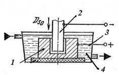 1 – заготовка(анод); 2 – инструмент(катод);