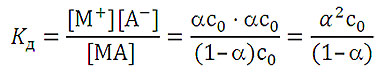 | Молярные концентрации веществ В начальный момент времени (τ0) К моменту достижения равновесия (τравн.) | MA с0 [MA] = (1−α)с0 | M+ [M+] = αс0 | A− [A−] = αс0 |
