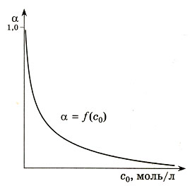 Зависимость степени диссоциации α от концентрации слабого электролита в растворе с0.