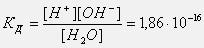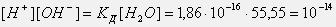 Такое значение константы соответствует диссоциации одной из ста миллионов молекул воды, поэтому концентрацию воды можно считать постоянной и равной 55,55 моль/л (плотность воды 1000 г/л, масса 1 л 1000 г, количество вещества воды 1000г:18г/моль=55,55 моль, С=55,55 моль: 1 л =55,55 моль/л). Тогда