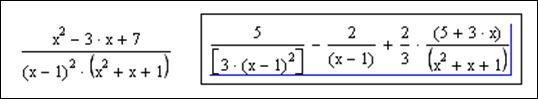 Введите аналогично как и в предыдущих примерах алгебраическое выражение, выделите с помощью мыши переменную х, далее выберите в меню Symbolic → Variable → Convert to Partial Fraction. Ниже приведен фрагмент рабочего документа MathCAD с соответствующими вычислениями.