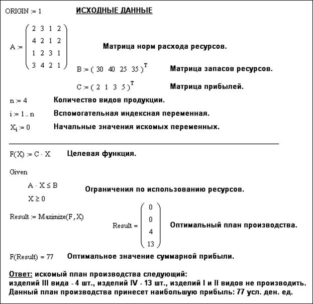 Рис. 38. Фрагмент MathCAD-документа: задача планирования производства