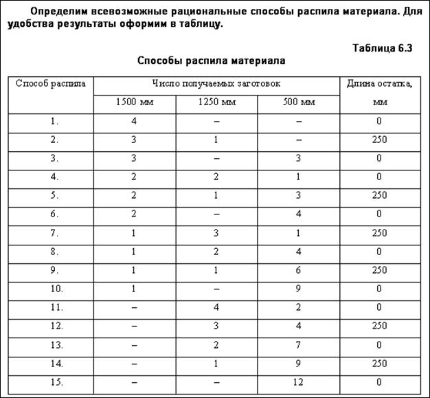 Пример 6.4. На заготовительный участок предприятия каждый месяц поступают 300 стальных труб диаметром 50 мм и длиной 6 м, которые необходимо нарезать на заготовки длиной 500 мм, 1250 мм, 1500 мм в соотношении 4:2:2. Составьте план распила материала, обеспечивающий максимальное число комплектов.