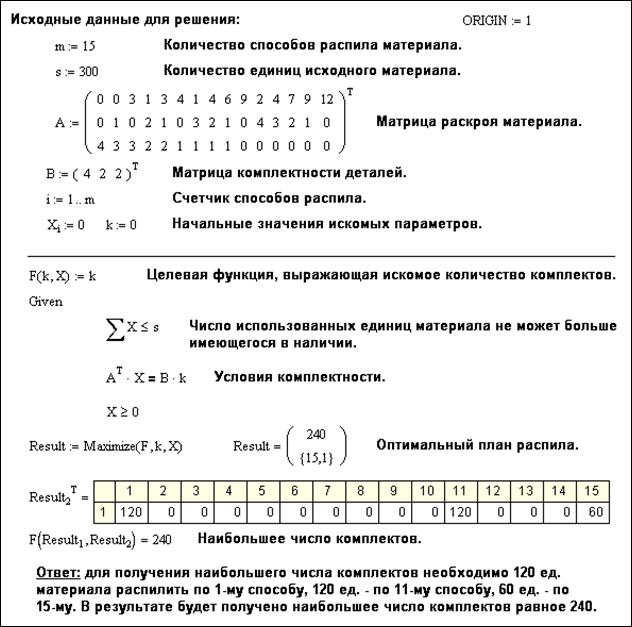 Рис. 42. Фрагмент MathCAD-документа: задача о раскрое материала