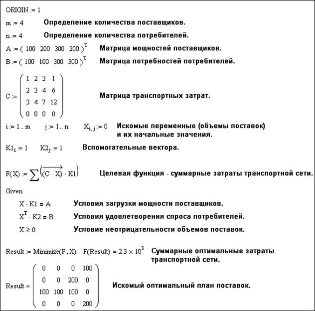 Рис. 43. Фрагмент MathCAD-документа: транспортная задача