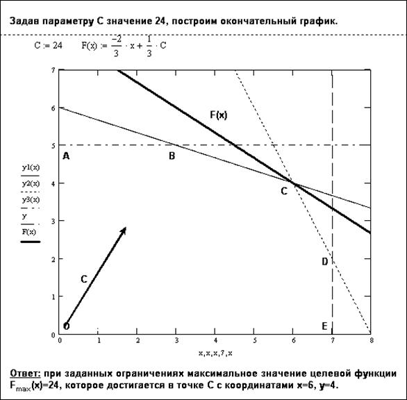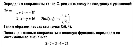 Рис. 48. Фрагмент MathCAD-документа: нахождение координат точки С и максимума целевой функции
