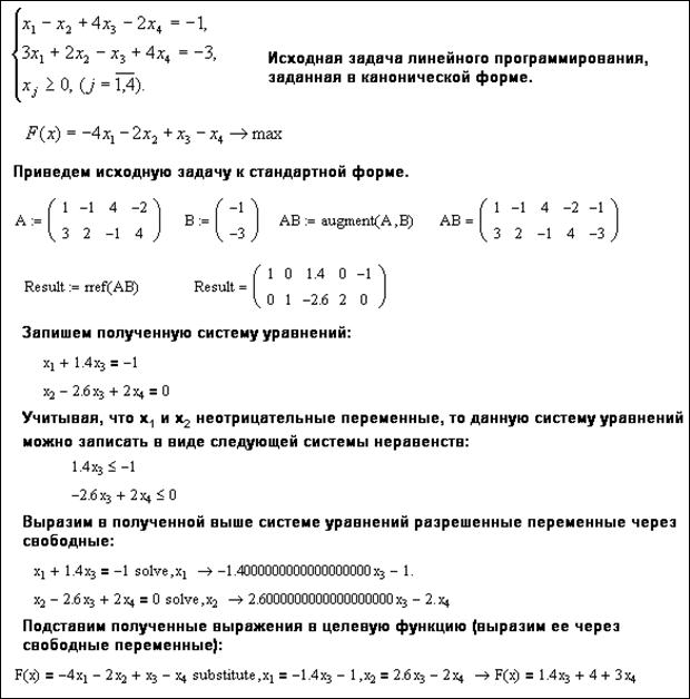 Рис. 50. Фрагмент MathCAD-документа: приведение исходной задачи линейного программирования к стандартной форме
