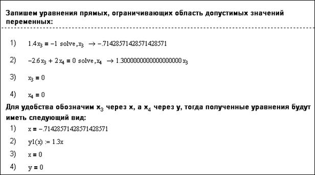 Рис. 44. Фрагмент MathCAD-документа: определение уравнений прямых, ограничивающих область допустимых решений задачи