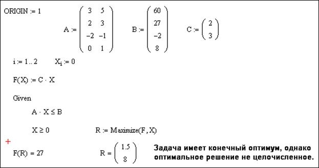 К сожалению, в стандартной поставке пакет MathCAD не обладает специализированным инструментарием реализации данных методов, а использование универсальных средств позволяет решать задачи целочисленного линейного программирования лишь в частном виде. Наиболее компактной формой реализации данных задач в системе MathCAD является сплошной перебор целочисленных значений переменных, реализация которого представлена на рис. 54-56.