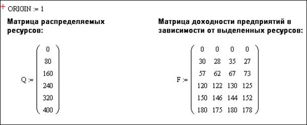 Фрагмент MathCAD-документа, реализующий решение данной задачи, приведен в приложении 4. На рис. 58 представлен блок ввода исходных данных. Вектор Q представляет множество возможных управленческих решений xi, матрица F определяет прибыльность предприятий в зависимости от выделенных ресурсов (размерности Q и F можно изменять). Особенностью программы является то, что первые компоненты вектора Q и матрицы F должны быть нулевыми, несоблюдение данного условия приведет к ошибочным результатам.