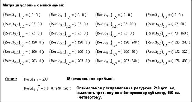 Рис. 59. Фрагмент MathCAD-документа: результаты решения задачи распределения ресурсов