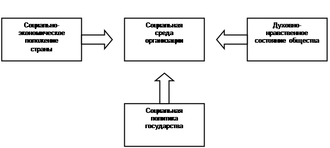 Значительное, а нередко решающее влияние на социальную среду организации, уровень благосостояния и качество трудовой жизни работников оказывают и более общие факторы. Имеются в виду, как показано на рис. 1.1, социально-экономическое положение страны, духовно-нравственное состояние общества, социальная политика государства.
