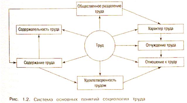 Особенности использования данных понятий, обусловленные необходимостью описания, изучения, объяснения и прогнозирования социальных явлений и процессов, относящихся к разным сторонам трудовой деятельности, отражаются (формально), как правило, добавлением к соответствующим понятиям определения «трудовые» (-ое, -ая, -ой). Так, например, для обозначения социальных отношений, связанных с трудовой деятельностью, используется понятие «социально-трудовые отношения». Для обозначения социальных процессов — понятие «социально-трудовые процессы». Подобные понятия социологии труда по сути являются общесоциологическими. Другую часть понятий социологии труда составляют специальные понятия, характеризующие трудовую деятельность как особую область социальных процессов и явлений. Наиболее важными из них являются: общественное разделение труда, характер труда, отчуждение труда, отношение к труду, удовлетворенность трудом, содержание и содержательность труда. Система этих понятий представлена на рис. 1.2.