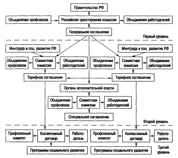 Для нормального функционирования система социально-трудовых отношений нуждается в регулировании и управлении на всех уровнях (государственном, региональном, организации) на основе государственной программно-нормативной регламентации, охватывающей все направления социально-трудовой сферы: занятость, условия и оплата труда, демографическая политика, миграционная политика и т.д. На уровне организации регулирование социально-трудовых отношений осуществляется с помощью системы коллективных договоров, в рамках которых определяются согласованные позиции работников той или иной организации и их работодателей по решению важнейших вопросов условий и оплаты труда, социальных выплат и компенсаций, социального обеспечения и страхования и т.д. Многоуровневая система регулирования социально-трудовых отношений в Российской Федерации представлена на рис. 1.4.