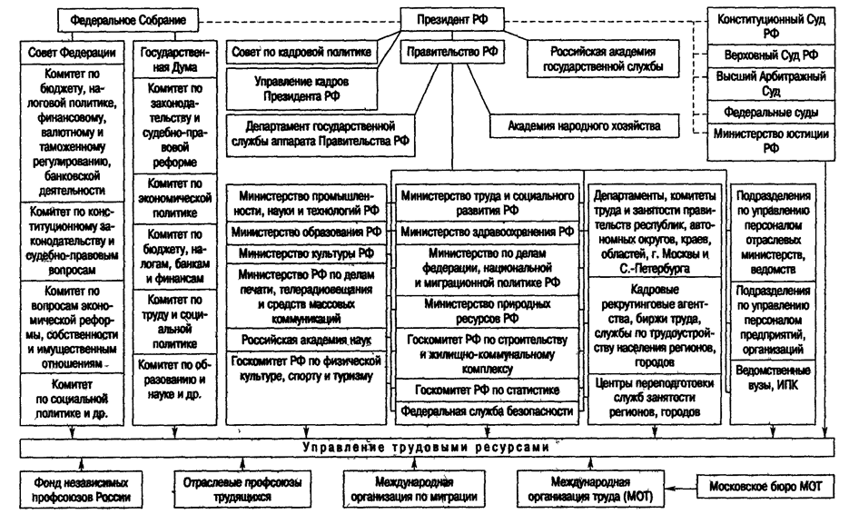 Государственная система управления трудовыми ресурсами Российской Федерации включает совокупность органов государственной законодательной, исполнительной и судебной власти и управления, централизованно регулирующих основные социально-трудовые отношения, а также методы управления и механизм их использования. Ее задачами являются принятие законов, контроль за их исполнением, выработка и реализация политики и рекомендаций в области социально-трудовых отношений в стране, охватывающих вопросы оплаты и мотивации труда, регулирования занятости и миграции населения, трудового законодательства, уровня жизни и условий труда, организации труда и конфликтных ситуаций и т.д. В условиях рыночных отношений государственное регулирование социально-трудовых отношений носит ограниченный характер и, как свидетельствует опыт развитых стран, касается вопросов трудового законодательства, занятости, оценки уровня жизни и некоторых других.