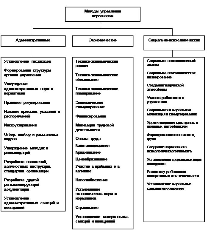 Методы управления персоналом (МУП) — способы воздействия на коллективы и отдельных работников с целью осуществления координации их деятельности в процессе функционирования организации. Наука и практика выработали три группы МУП: административные, экономические и социально-психологичекие (рис. 2.5).