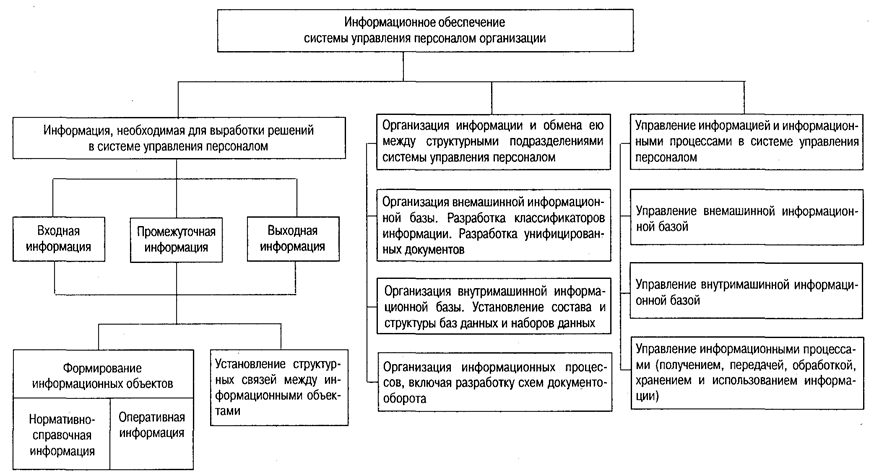 Главные функции процесса управления персоналом, реализуемые на разных уровнях системы управления организацией, — выработка решений и контроль за их исполнением. Именно необходимость обеспечения выполнения этих функций дает возможность рассматривать управление персоналом как информационный процесс, т.е. функционально включающий получение, передачу, обработку (преобразование), хранение и использование информации, а саму иерархическую систему управления— как информационную систему.