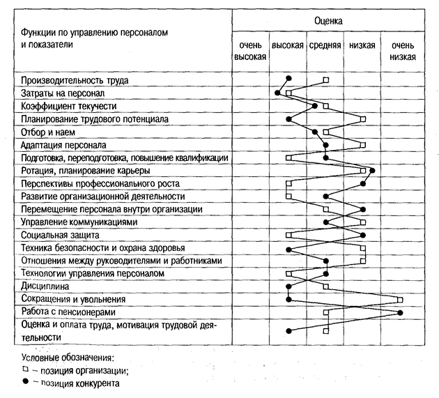 Выявление сильных и слабых сторон отражает самооценку организации и позволяет ей сравнить себя с основными конку рентами на рынке труда и, возможно, на рынке сбыта. Оценку можно провести по отдельным показателям и функциям управления персоналом с помощью так называемого конкурентного профиля (табл. 4.7). Оценка отдельных показателей проводится методом сравнительного анализа, а функций управления — экспертным методом.