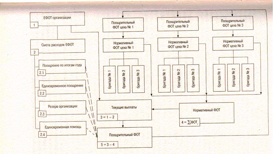 Такая система формирования фондов оплаты труда позволяет более тесно увязать интересы подразделений на разных уровнях управления производством; в то же время исключается возможность перерасхода средств в целом по организации, закладывается гибкая прямая и обратная связь между фондами оплаты организации и фондами оплаты подразделений, первичных трудовых коллективов.