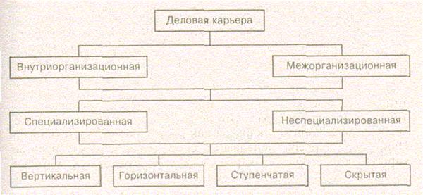 Начинается деловая карьера с формирования субъективно осознанных собственных суждений работника о своем трудовом будущем, ожидаемом пути самовыражения и удовлетворения трудом. Иначе говоря, карьера — это индивидуально осознанная позиция и поведение индивида, связанные с трудовым опытом и деятельностью на протяжении рабочей жизни человека. Различают несколько видов карьеры (рис. 7.3).