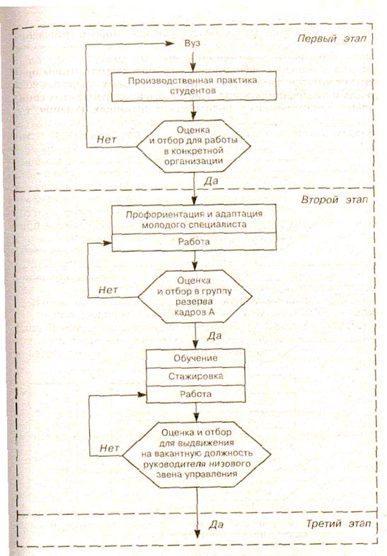 Первый этап — работа со студентами старших курсов базовых институтов или направленных на практику из других вузов. Специалисты подразделений управления персоналом совместно с руководителями соответствующих подразделений, где проходят практику студенты, проводят подбор студентов, наиболее способных, склонных к руководящей работе, и подготовку их к конкретной деятельности в подразделениях организации. Студентам, успешно прошедшим подготовку и практику, выдается характеристика-рекомендация для направления на работу в соответствующие подразделения данной организации. Молодые специалисты, не проходившие практику в данной организации, при приеме на работу тестируются и им оказывается консультационная помощь.